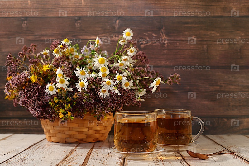 Чай из диких лекарственных трав на деревянном столе, букет герба святого Иоанна, орегана, мяты, ромашки, коллекция полезных трав для лечения в соответствии с народными рецептами