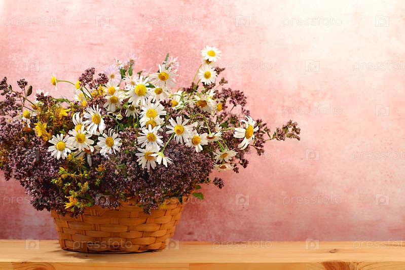 Цветочное расположение дикорастущих лекарственных трав на деревянном столе в корзине, букет яства Иоанна, орегано, мяты, ромашки, коллекция полезных трав для лечения по народным рецептам