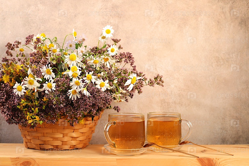 Чай из диких лекарственных трав на деревянном столе, букет герба святого Иоанна, орегана, мяты, ромашки, коллекция полезных трав для лечения в соответствии с народными рецептами