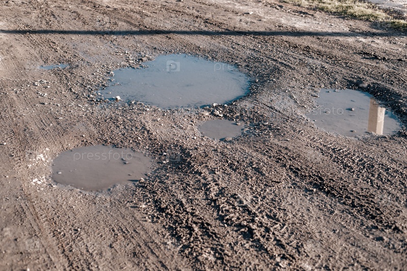 Закрытие грунтовой дороги с несколькими лужайками воды, показывающие текстуру земли и отражения