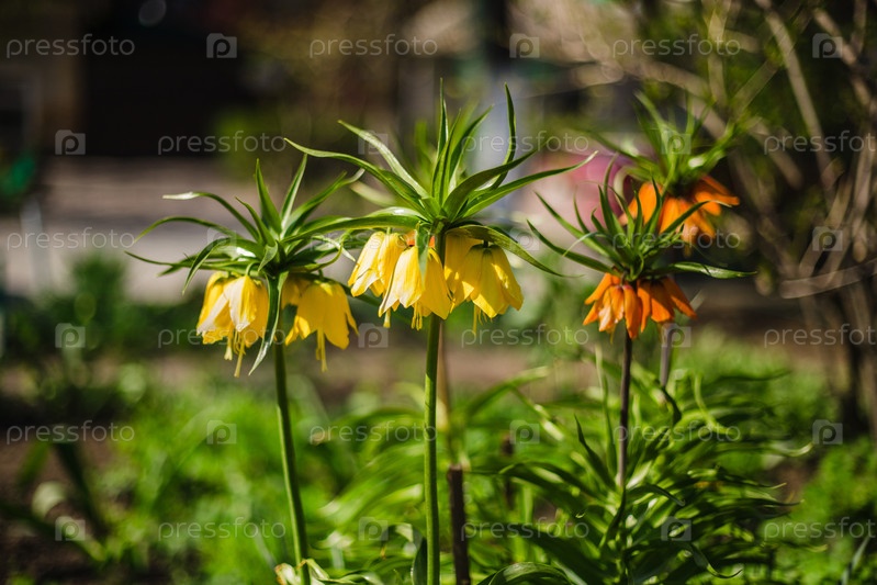 Fritillaria Imperialis.В солнечный день в пышно-зеленом саду
