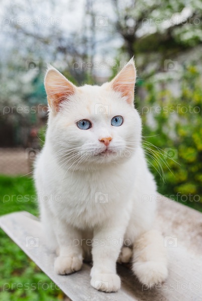 Красивый белый кот с ярко-голубыми глазами сидит снаружи и пристально смотрит