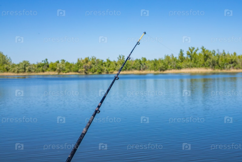Рыболовная трость простирается к воде в солнечный день, захватывая прекрасную сцену на свежем воздухе