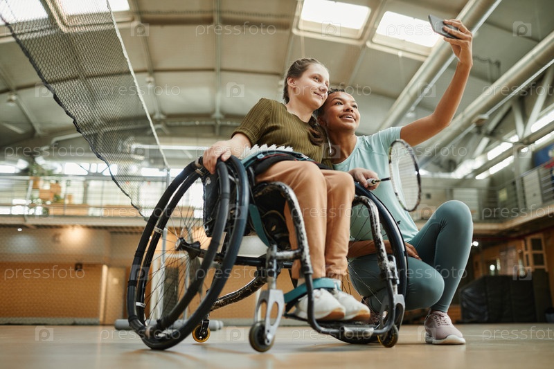 Молодая женщина в инвалидном кресле делает селфи