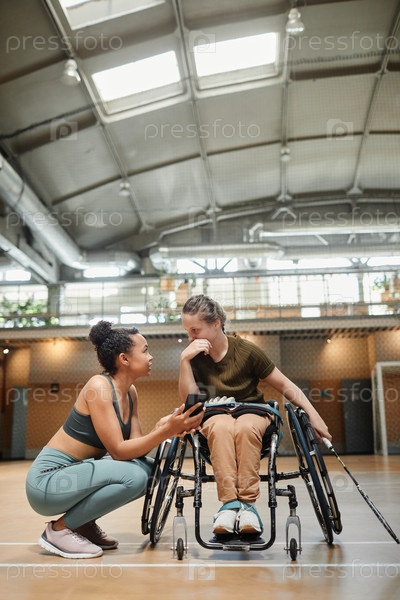 Портрет молодой спортсменки с инвалидностью, разговаривающей со своим другом
