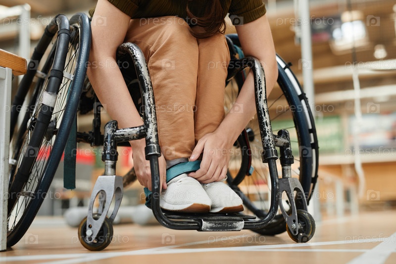 Женщина, привязывающая ноги к инвалидному креслу