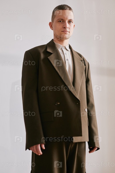 Портрет молодого взрослого мужчины в костюме, стоящего на стене
