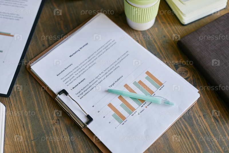 Маркетинговый отчет с штрих-графиками, лежащими на деревянном офисном столе
