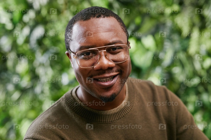 Портрет молодого взрослого чернокожего мужчины, улыбающегося уверенно в деловой обстановке