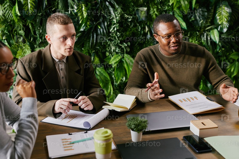 Мультиэтнические молодые взрослые мужчины обсуждают бизнес-стратегию во время офисной встречи