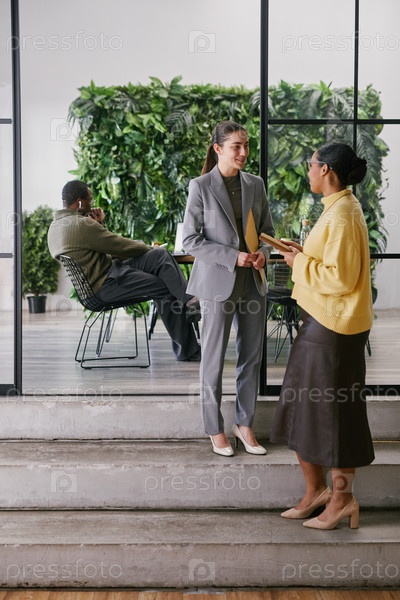 Молодая женщина и чернокожая женщина обсуждают бизнес в офисе