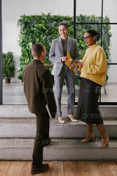 Мультиэтнические молодые взрослые бизнес-профессионалы, обсуждающие проекты в помещении