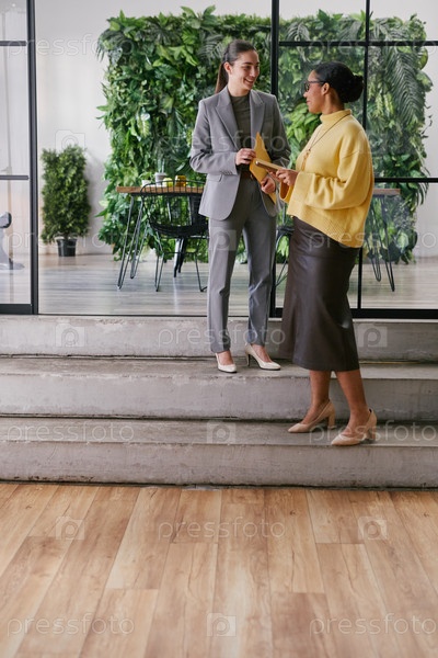 Две молодые взрослые бизнес-женщины обсуждают документы в современной офисной обстановке