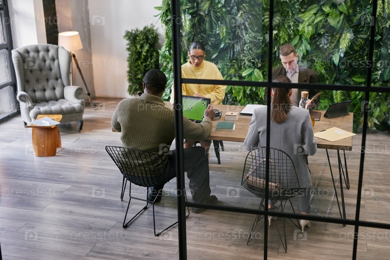 Мультиэтнические молодые взрослые сотрудничают во время деловой встречи в офисе