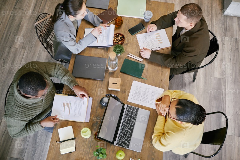 Различные молодые взрослые сотрудничают во время деловой встречи за круглым столом