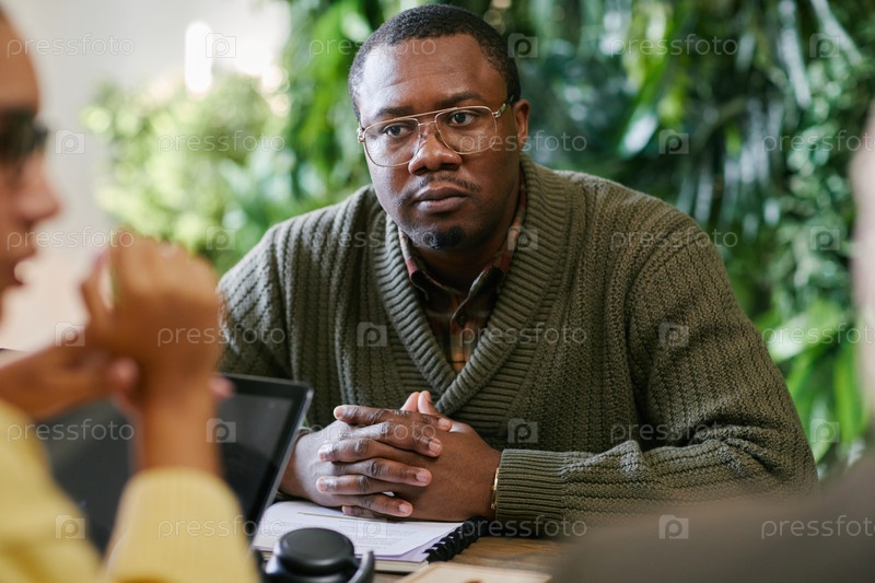 Портрет чернокожего мужчины среднего возраста, посещающего деловую встречу в помещении