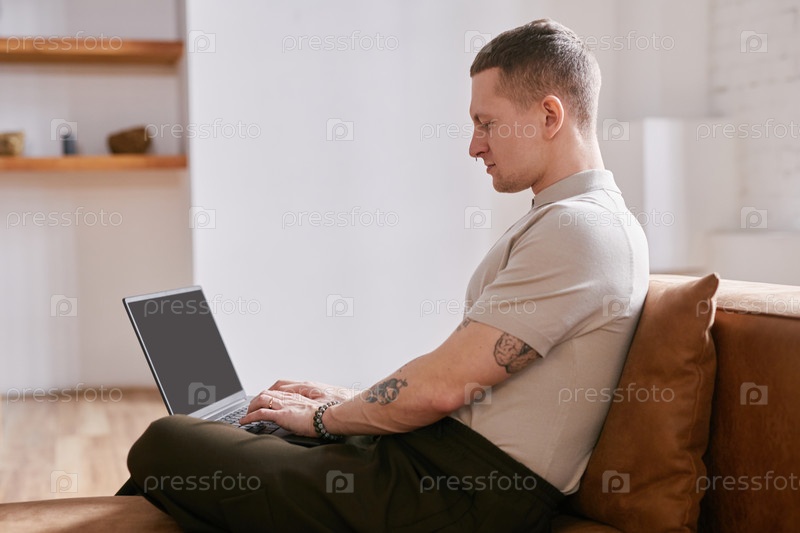 Молодой взрослый мужчина работает удаленно, используя ноутбук в домашнем офисе