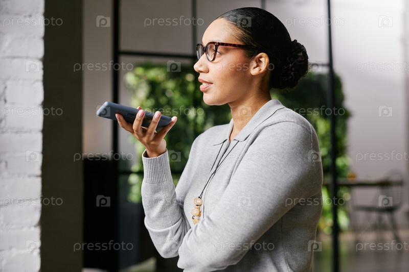 Молодая взрослая чернокожая женщина использует голосовой помощник смартфона в современном офисе