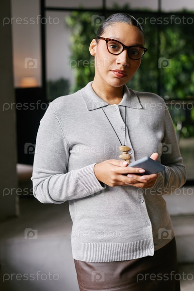Портрет женщины, держащей смартфон в современной офисной обстановке