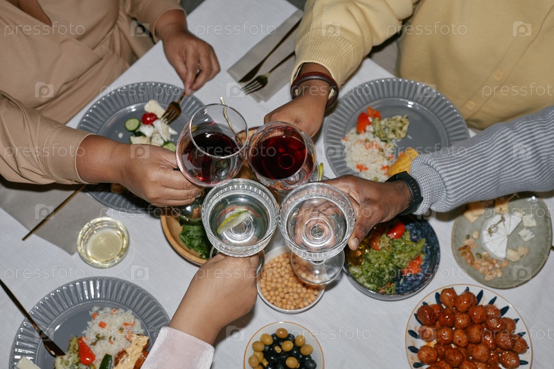 Разнообразная группа сжимает очки, празднуя ужин вокруг стола