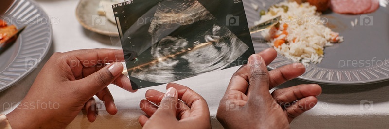 Заголовок Изображение родителей, держащих ультразвуковое изображение во время обеда