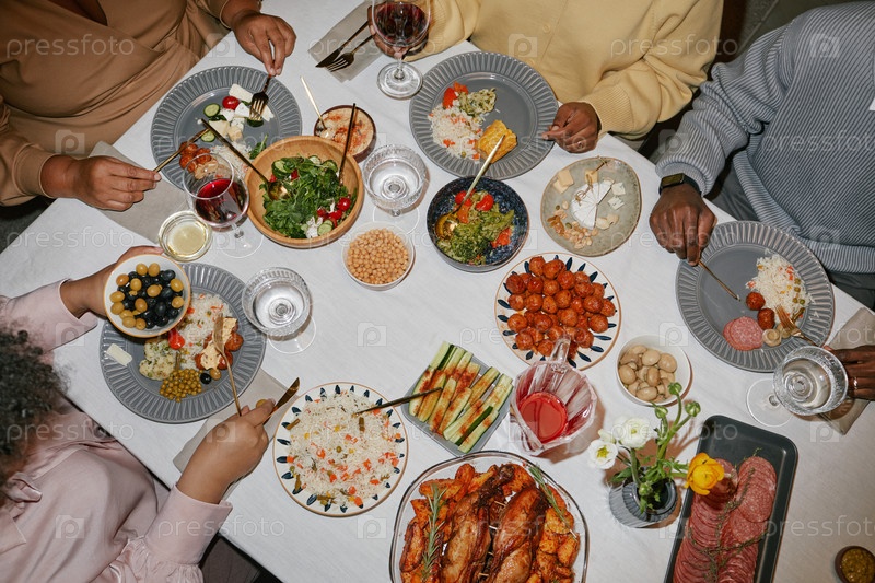 Семья наслаждается праздничным ужином, сидя за столом с закусками и напитками