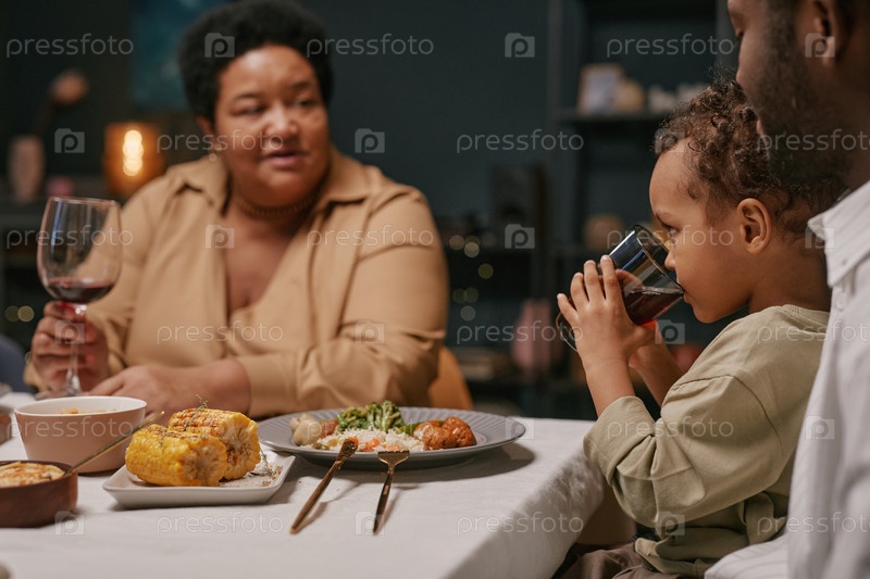 Черный мальчик пьет из стекла, сидя с семьей за обеденным столом