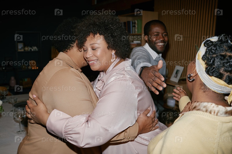 Черная семья празднует воссоединение обнимаясь и улыбаясь дома