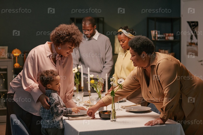 Черная семья подает обеденный стол во время праздничного торжества дома