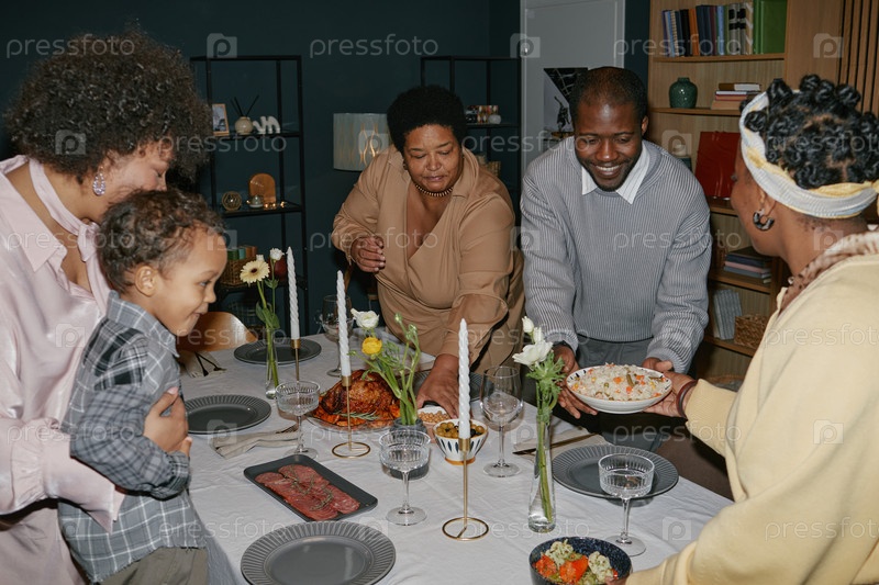 Черная семья празднует торжественный ужин, собирается вокруг стола