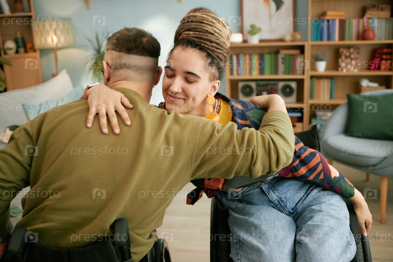 Молодая женщина и мужчина с инвалидностью обнимаются в гостиной
