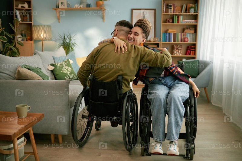 Молодая улыбающаяся женщина в инвалидном кресле обнимает друга с ограниченными возможностями дома