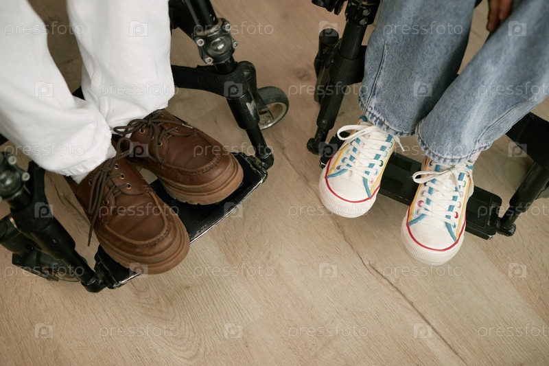 Ноги мужчины в формальных туфлях и женщины в кроссовках сидят на инвалидных колясках внутри