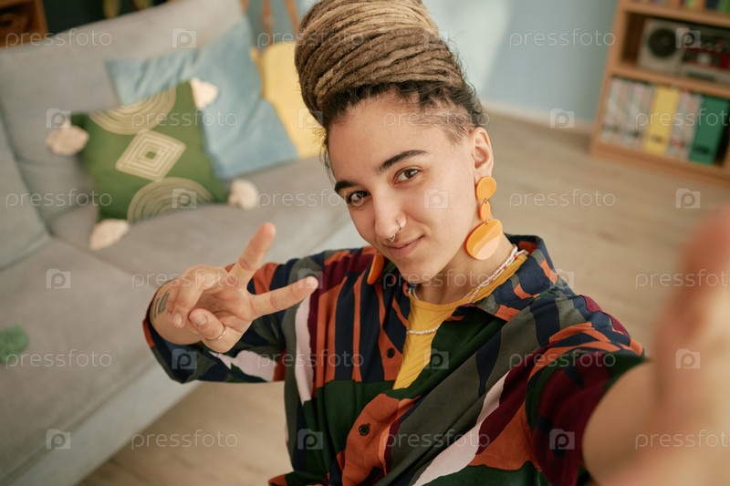 Портрет взрослой женщины, улыбающейся и жестикулирующей знак мира для селфи дома