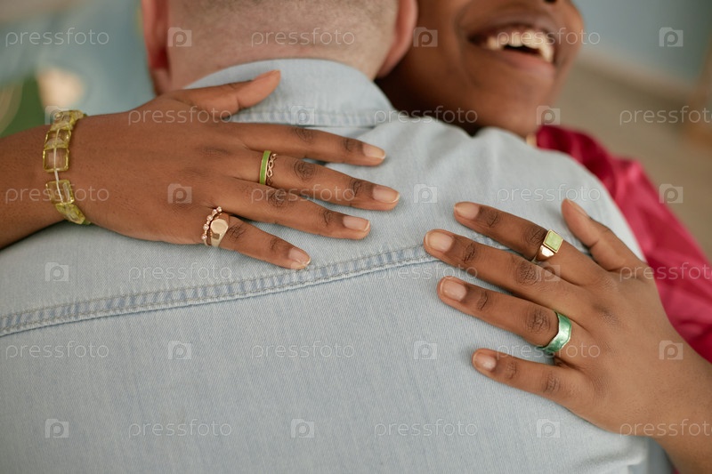 Молодой мужчина и молодая чернокожая женщина обнимаются и празднуют день рождения