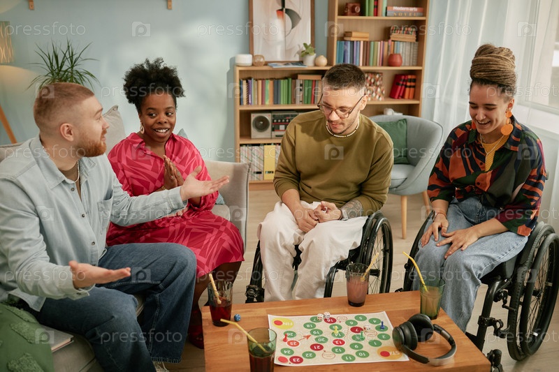 Мультиэтнические молодые взрослые в инвалидной коляске смеются и играют в настольную игру на день рождения