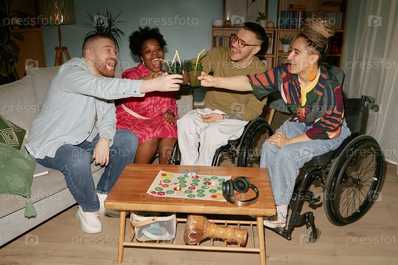 Разнообразные молодые взрослые с инвалидностью празднуют день рождения и выпивают вместе