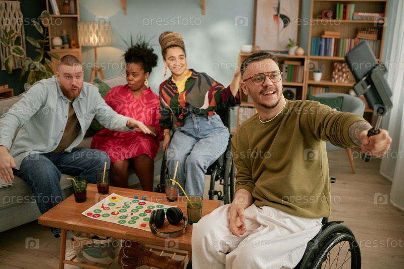 Группа молодых взрослых с инвалидностью празднует день рождения и делает селфи