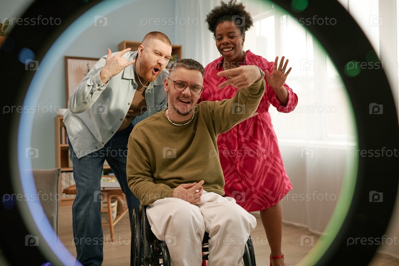 Портрет молодого человека с инвалидностью, празднующего день рождения со своими друзьями дома
