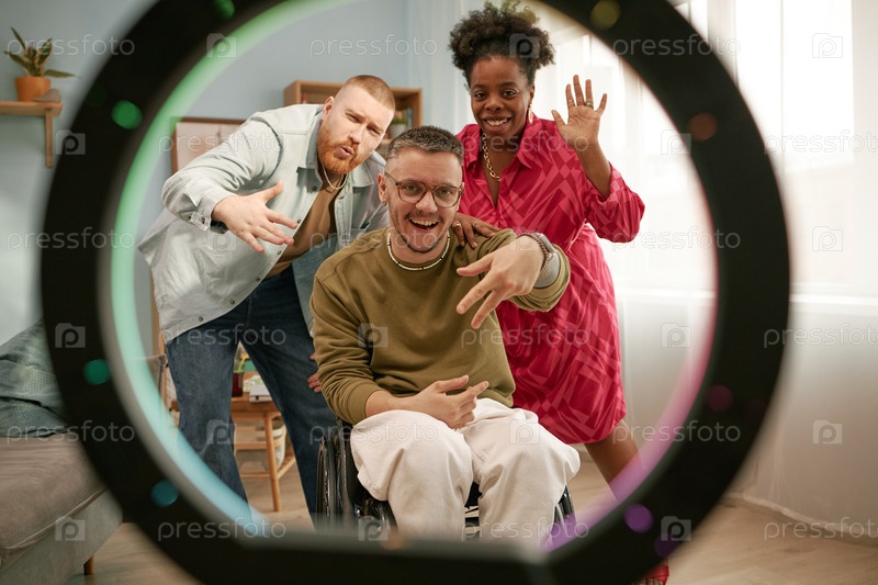 Разнообразные молодые взрослые записывают видео с использованием кольцевого света дома