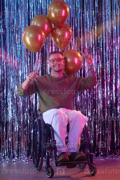 Портрет молодого человека с инвалидностью, празднующего день рождения в инвалидном кресле