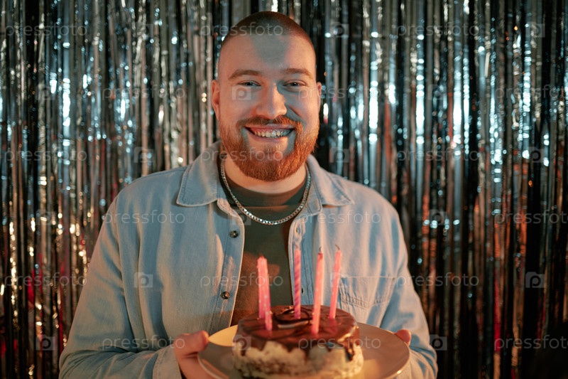Портрет молодого взрослого мужчины, улыбающегося в то время как он держит день рождения пирог