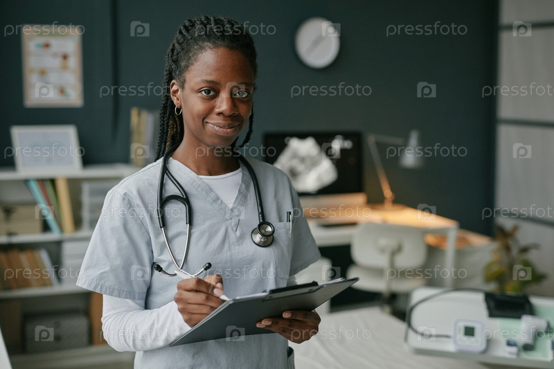 Портрет женщины-врача с наклейкой, улыбающейся в камеру