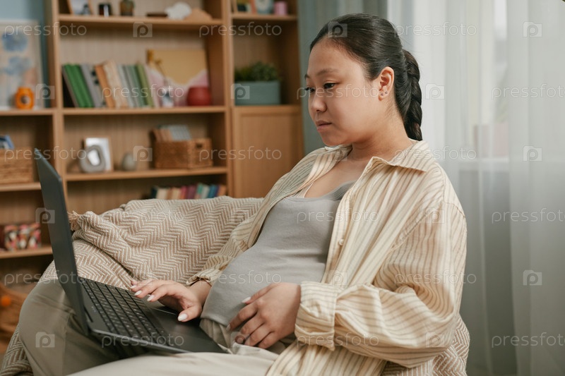 Беременная молодая взрослая азиатская женщина просматривает Интернет, отдыхая в помещении