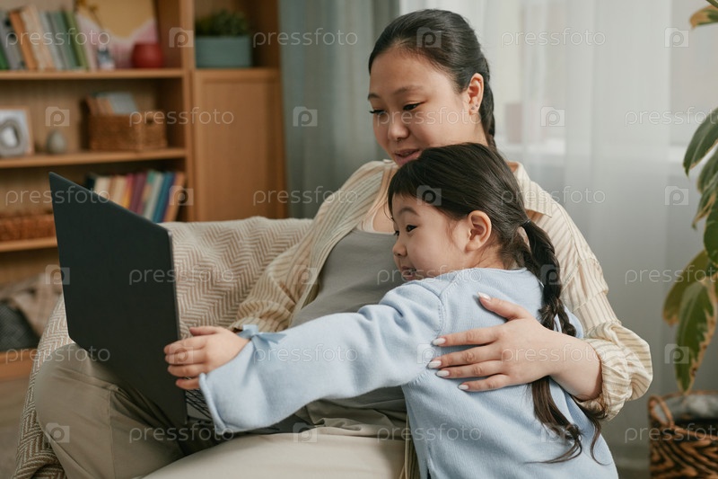 Беременная азиатская женщина проводит свободное время с маленькой дочерью, используя ноутбук