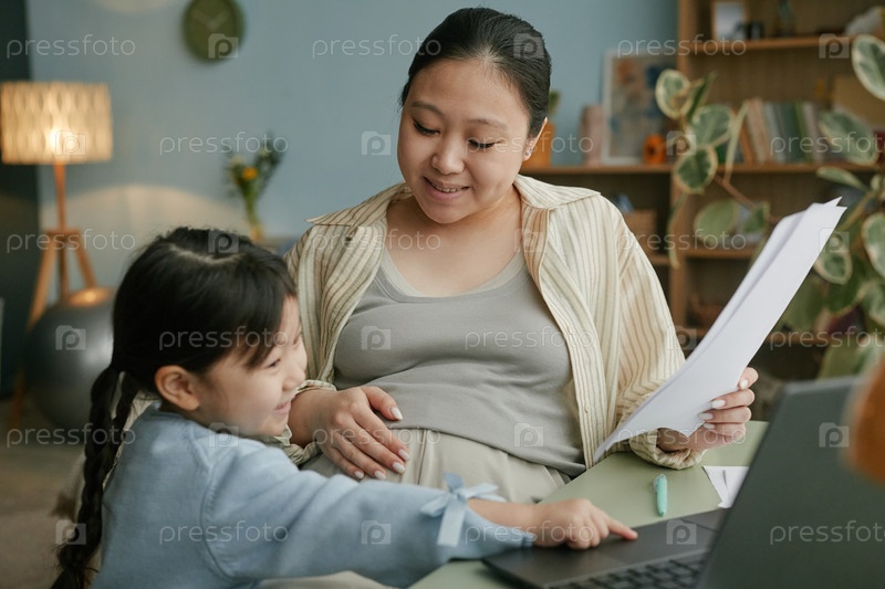 Беременная азиатская женщина проводит время с маленькой дочерью, используя ноутбук дома
