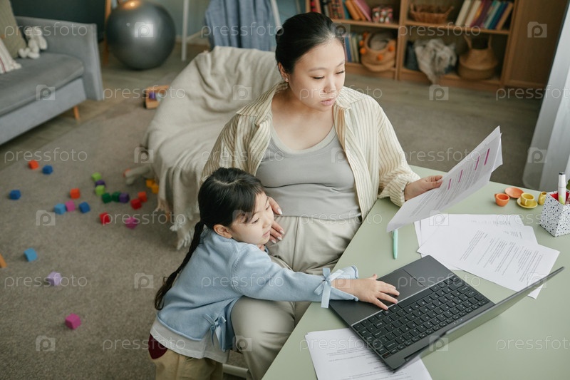 Беременная азиатская женщина проводит время с дочерью, работая из дома