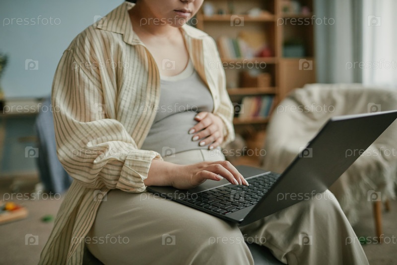 Беременная молодая взрослая азиатская женщина использует ноутбук, сидя дома