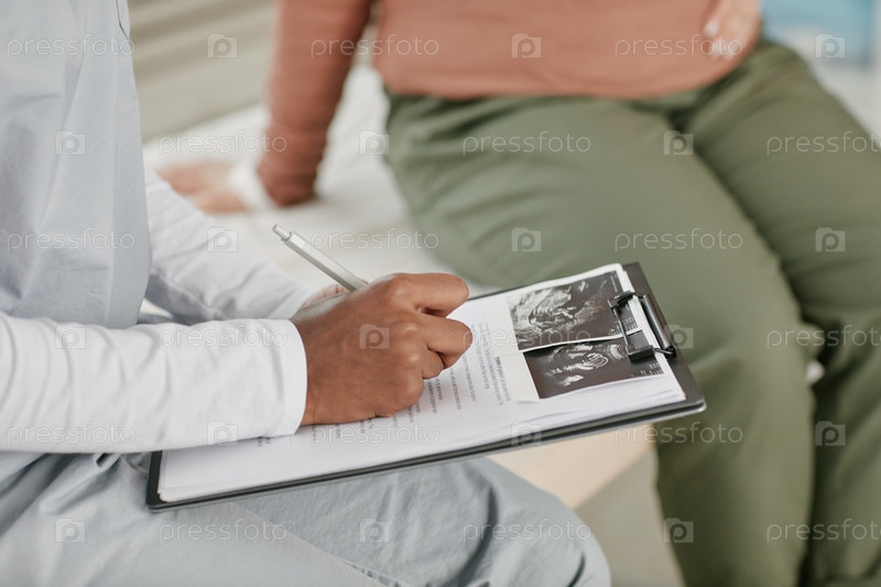 Беременная азиатская женщина посещает пренатальный осмотр с женщиной-врачом, пишущей записки