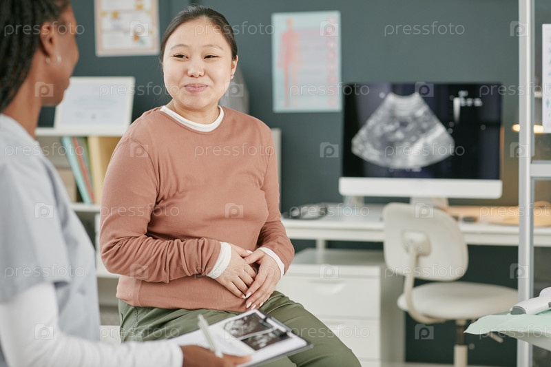 Молодая взрослая азиатская женщина, посещающая врача для пренатального ухода УЗИ